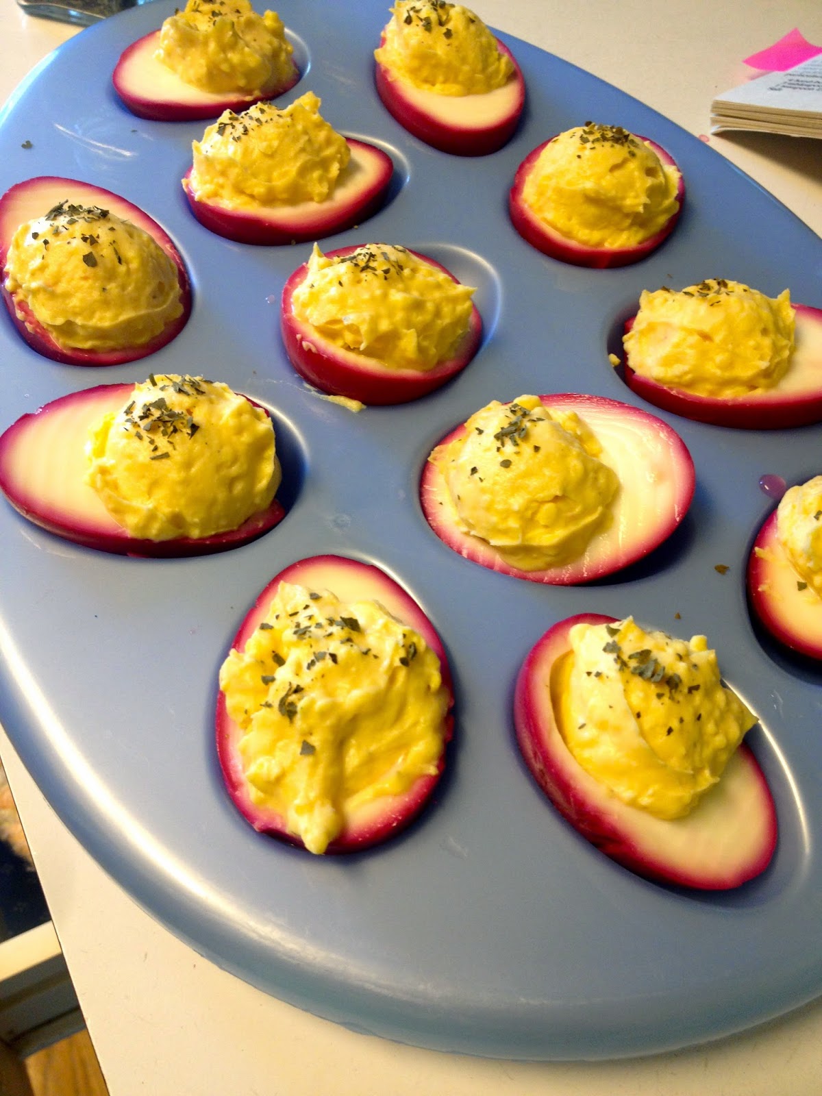 One day on either Pinterest or Facebook I came upon a recipe for pink deviled eggs!